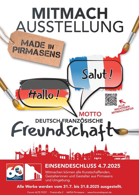 Wer als Hobby-Künstlerin oder Hobby-Künstler seine Kunstwerke im Rahmen von „Made in Pirmasens“ ausstellen möchte, kann bis zu drei Werke am Donnerstag, 3. Juli, und Freitag, 4. Juli 2025 von 11-17 Uhr im Forum ALTE POST anliefern. Die Kunstwerke sollten sich auf kreative Weise mit dem Motto auseinandersetzen. Dabei sind den Ausdrucksformen keine Grenzen gesetzt: Ob Malerei, Fotografie, Skulpturen oder textile Kunst, alle Arbeiten sind willkommen.